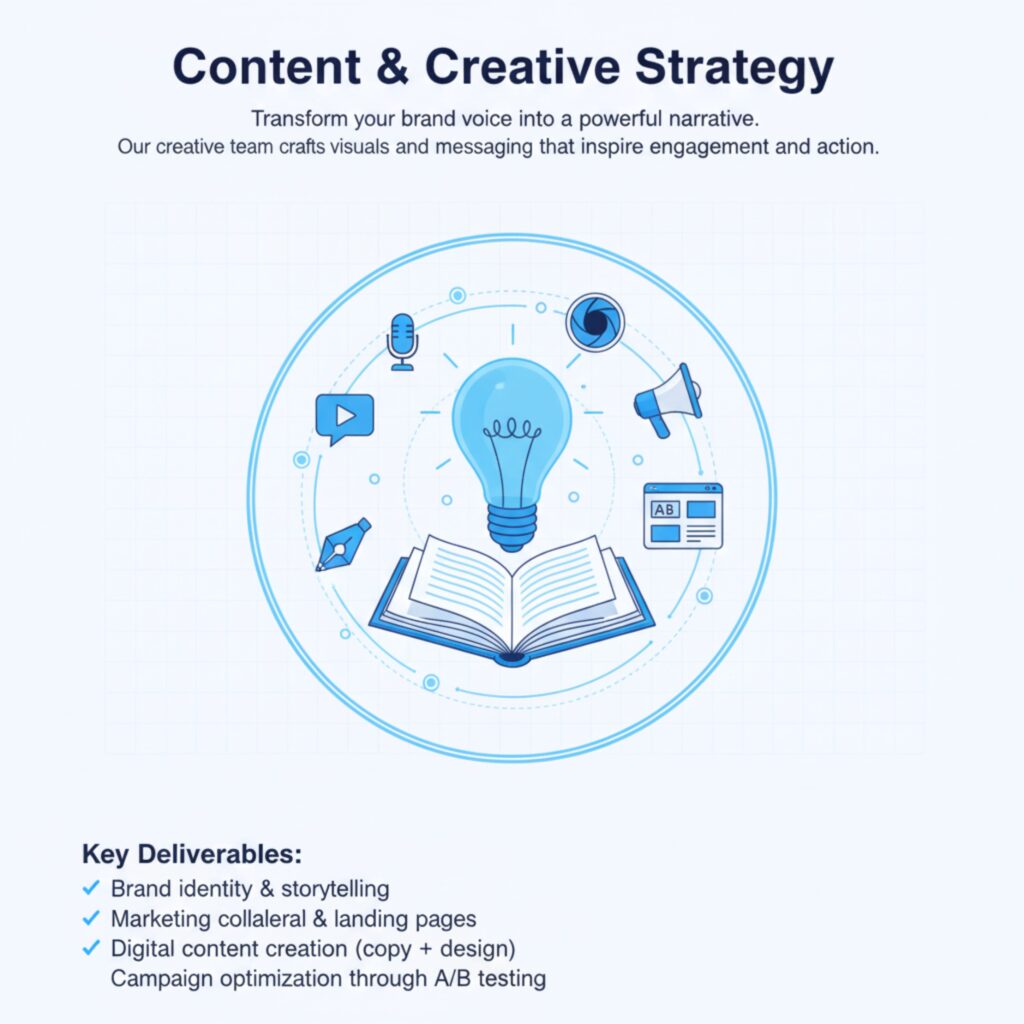 We align creativity with strategy. Every word, design, and idea we craft serves a business goal — whether it’s awareness, engagement, or conversion. Our creative team blends analytical precision with artistic expression to ensure your brand stands out in a crowded digital space.